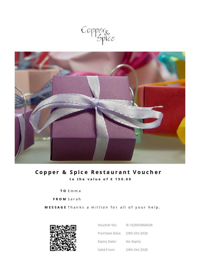 Copper & Spice allows you to purchase instantly printable gift vouchers, special offers and tickets using the Voucher Connect platform.